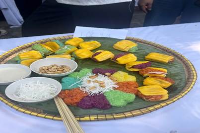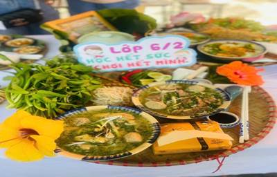 Bên cạnh các hoạt động vui chơi và trải nghiệm văn hoá, các em học sinh còn được thưởng thức nhiều món ăn dân gian hấp dẫn như bánh bò, chè, mì quảng, cao lầu…. Những món ăn quen thuộc đậm đà hương vị truyền thống quê hương không chỉ mang đến sự thích thú, mà còn giúp các em hiểu thêm về nét đẹp ẩm thực quê hương.